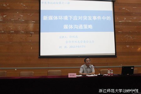 9月7日下午,金华市双龙管委会主任徐祝成应邀来我院为MPA学员做了题为“新媒体环境下应对突发事件中的媒体沟通策略”的专题讲座,同时也是我院市长书记论坛第十一讲,讲座由我院副院长周志山教授主持。